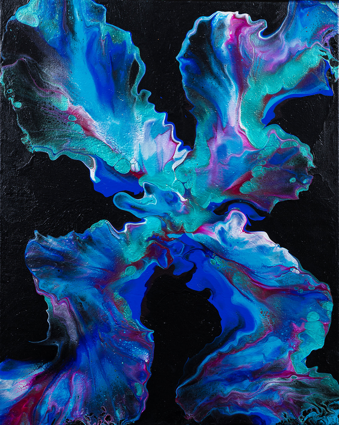 "Nightfall Symphony" combines the fluidity of the Dutch pour technique with a striking color palette. This painting showcases the beauty of flowing acrylic paints on a black background, resulting in a captivating display of vibrant blues set against a deep, velvety black canvas.