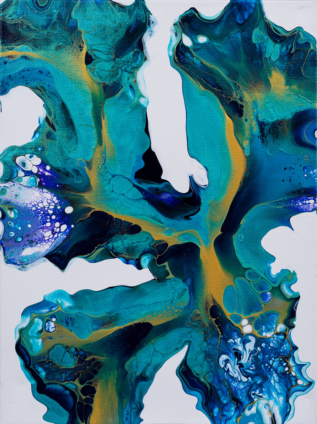 "Tranquil Tides" skillfully employs the Dutch pour technique, which involves pouring acrylic paints onto the canvas and manipulating them to create intricate patterns and unique color interactions. The blues used in this artwork range from deep navy to vibrant cerulean, creating a dynamic and visually engaging composition.