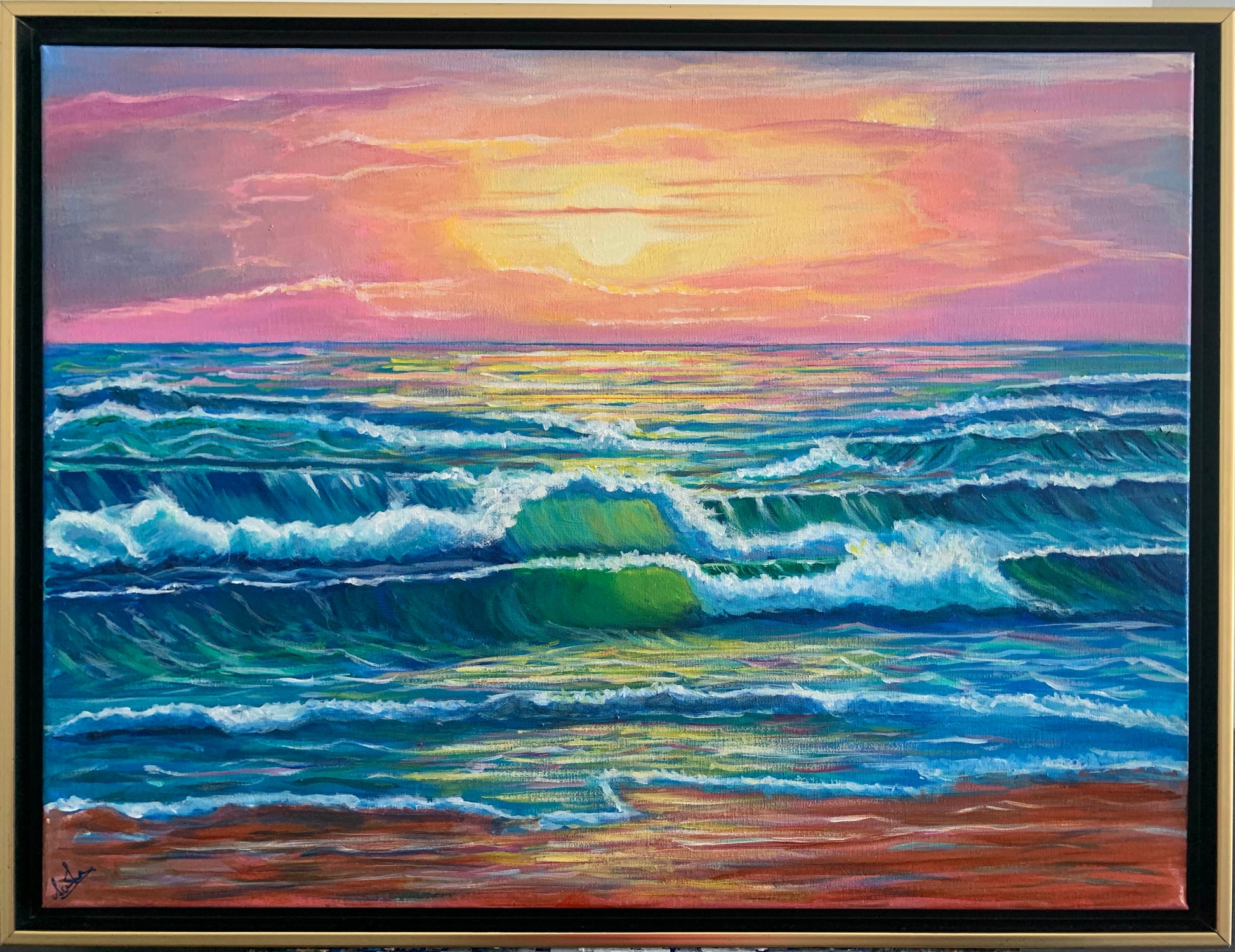 A beautiful golden floater frame enriches this artwork that is ready-to-hang.